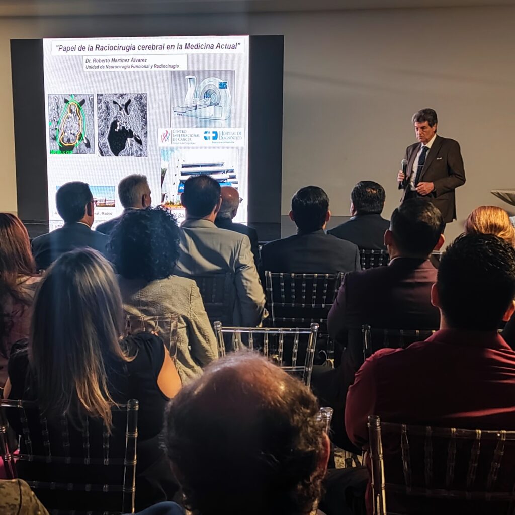 Se inicio el evento con la participación de Dr. Eduardo Lovo, neurocirujano especialista en radiocirugía/ neurocirugía explico cómo se introdujo la radiocirugía en el país a inicios del 2014 y los casos de éxito a la fecha.